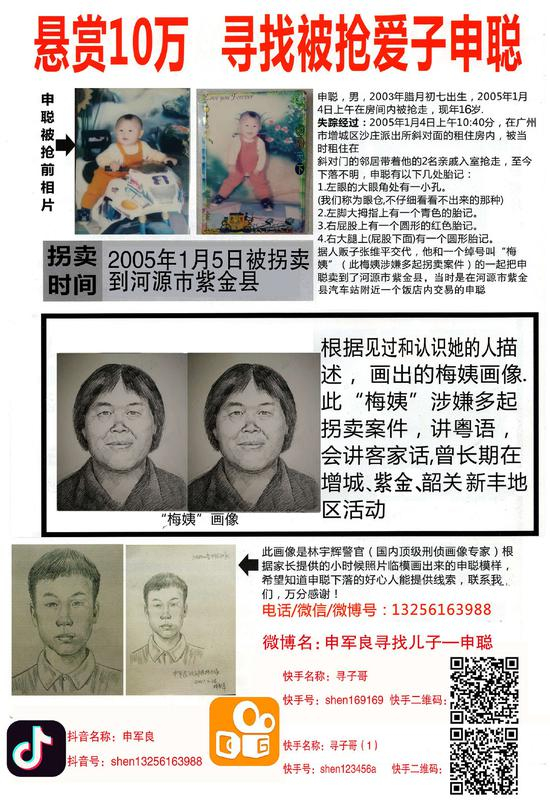 据澎湃新闻此前报道,2005年1月4日,在广州增城的一间出租屋,1岁男童申聪被两名男子冲进屋内抢走。此后,孩子父亲申军良踏上漫长的寻子之路。2016年3月,此案犯罪嫌疑人周容平、张维平等5人先后落网。这5人均是贵州省绥阳县人。据张维平供认,当年他通过中间人“梅姨”牵线,以1.3万元将申聪卖给河源市紫金县一对夫妇。