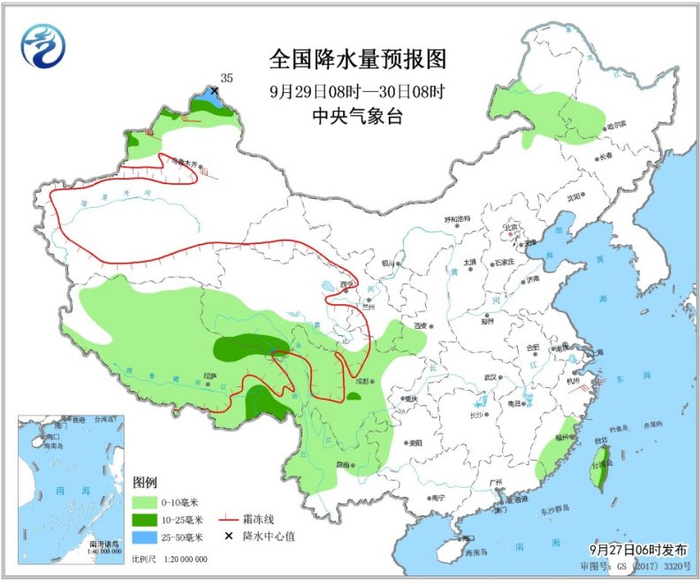 9月28日08时至29日08时,黑龙江北部、新疆北部、西藏、西南地区北部和南部、四川盆地西部、陕西中部和南部以及台湾岛等地部分地区有小雨或中雨。北疆北部部分地区有5~6级及以上风,山口风力7~8级。