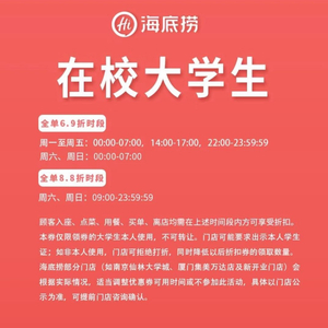 在此之前,海底捞的大学生6.9折优惠是周一至周日通用的,在周一至周五下午2点至5点、晚10点至次日晨7点,以及周末零点至7点三个时间段内都能使用。周末从早9点至第二天凌晨还能享受全单8.8折的优惠。优惠规则调整之后,不仅削弱了优惠力度,还取消了“下午场”,只留下晚10点后的夜宵专场。