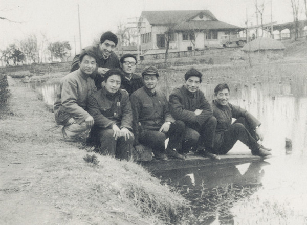 1973年,汪观清(前排右二)与韩和平(前排右一)、郑家声(前排左一)在枫泾荷花塘前合影。