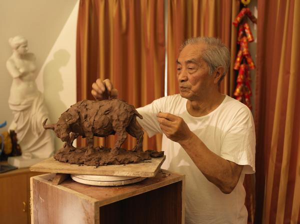 汪观清以《击角歌商》中的牛为参照,制作泥塑小稿