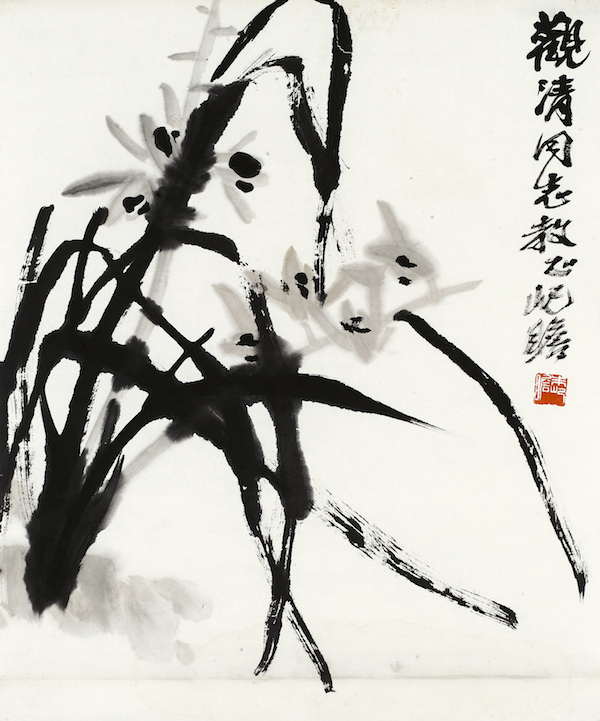 在与朱屺瞻的接触中,汪观清也得到不少感悟,尤其记得朱屺瞻画兰花,说着汪观清模仿起当时朱屺瞻的用笔,“就像这样,一根线条、两根线条……我初看上去,怎么不太像兰花叶子呀?我喜欢看他的线条之间穿插,这支笔蘸一点水,再蘸点藤黄,点花蕾,再用小笔蘸焦墨,点几点化开来,湿润润的对比,很亮,淡墨中有一点藤黄。朱屺瞻却说‘这叫白相相,瞎遢遢’。”