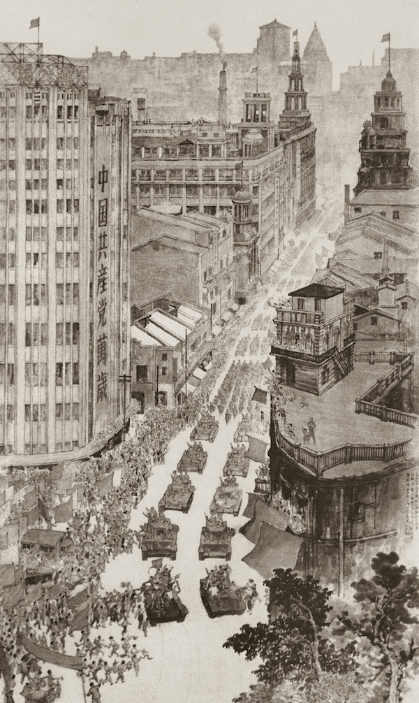 现年89岁的画家汪观清也见证了这一幕。那一年他18岁,住在外滩附近,看到解放军露宿在金陵路的骑楼之下。十年后,当为“新中国成立十周年”筹备展览时,他想到了那个清晨,随后跑到南京路的百货公司楼上,以俯视的视角默写了1949年解放军进入上海时受到市民夹道欢迎的盛况。