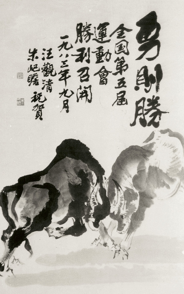 汪观清与朱屺瞻先生为庆祝全国第五届运动会胜利召开合作斗牛图《勇则胜》。