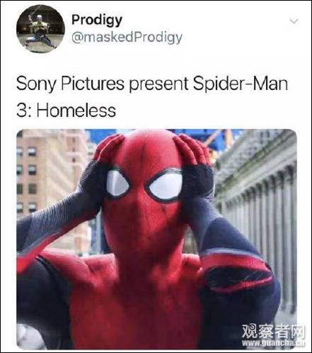大家急得一度帮第三部《蜘蛛侠》想好了副标题:“Homeless”(无家可归)。(前两部分别叫“Homecoming”英雄归来和“Far From Home”英雄远征。)