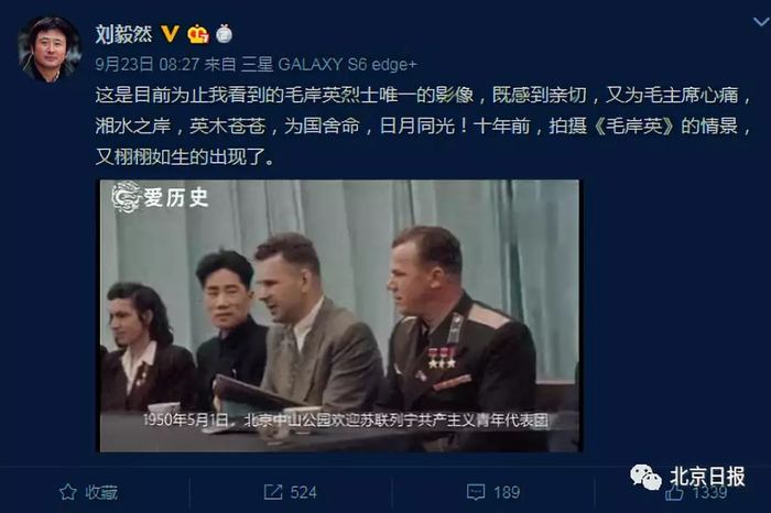 曾经执导过电视连续剧《毛岸英》的中国当代作家、导演刘毅然,近日在其微博公布了一段毛岸英的珍贵彩色影像。