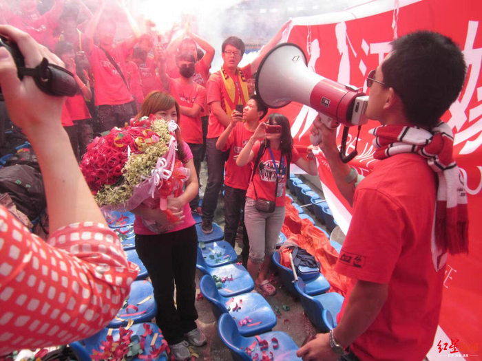 2011年5月22日,成都市体育中心南看台7区,这是卢麒文永远不忘的记忆。他在这一天向他现在的老婆求婚。“刀锋的骨干成员一起帮我提前了2个多月策划,横幅的设计也是刀锋的设计师帮我设计的,细节到采访什么样的焰火、什么时候放、准备什么样的彩礼花,都是当时刀锋的会员一起帮我想的”。