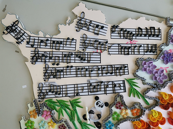 地图上,每个省、自治区、直辖市都有不同的衍纸作品来装饰,七彩的花朵装饰云南、可爱的大熊猫装饰四川等,还点缀了《歌唱祖国》的五线谱,地图周围装点着喜庆的大红灯笼和代表欣欣向荣的向日葵。这些灯笼和向日葵都是钩针编织的,同样是来自于居民的巧手。