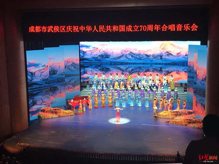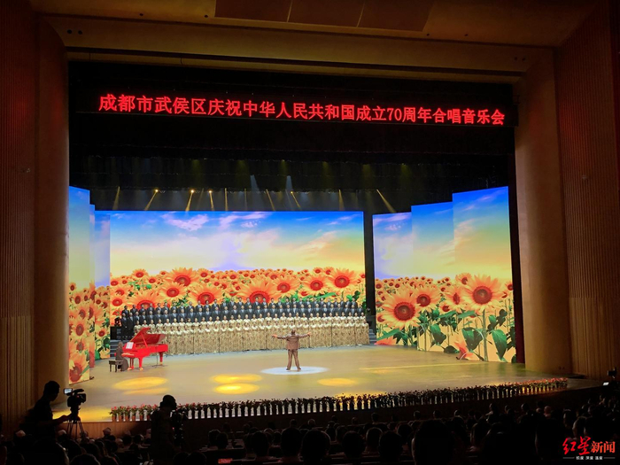 气势恢宏的城市音乐厅歌剧厅,在专业舞台、灯光、音响的衬托下,充满激情的合唱表演,给现场观众以强烈震撼。 “整台音乐会中我们穿插了朗诵、舞台剧、小音乐剧,演出形式丰富多样。在彩排时,还有演员专门就某个细节和我们导演组多次讨论、演练,大家都争取在中华人民共和国成立70周年为观众奉献一场高水平高质量的合唱音乐会。”担任音乐会总导演的任飞翔介绍说,参演团队是由前期武侯区庆祝中华人民共和国成立70周年合唱比赛区级部门、街道及武侯新城、驻区企业三个组别中的优秀队伍组成,特邀驻区高校共同参与。音乐会共有1500多名群众登台演唱。