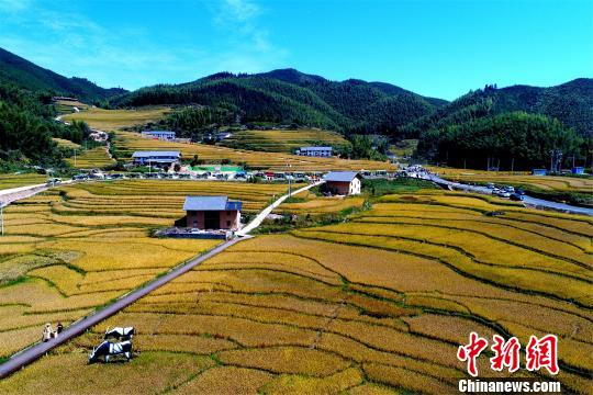 航拍江西崇义上堡万亩梯田 金色稻浪美如画(图)
