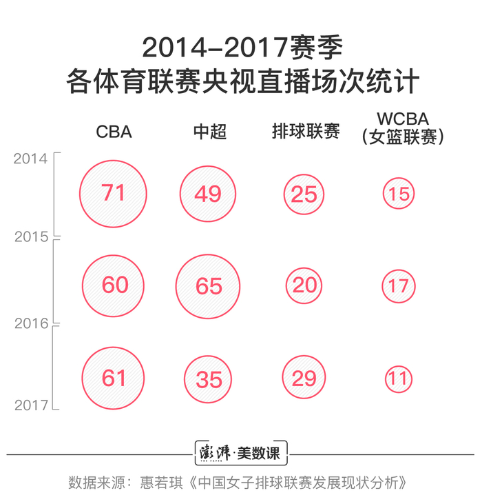 惠若琪在她的硕士论文中,列举了几点造成该现象的因素。她统计了国内媒体对女排赛事的转播数量: