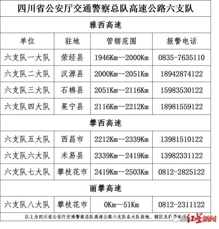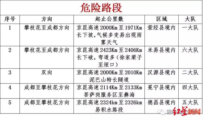 雅西高速西昌至成都方向,泥巴山隧道出口至荥经收费站路段(长下坡);攀西高速双向,泸黄改扩建施工路段;攀西高速昆明至成都方向,田房安检站至总发收费站路段(长下坡)。