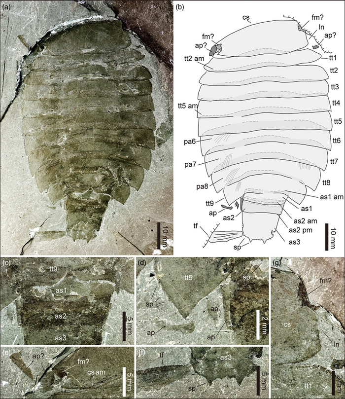 此次在山东发现的西德尼虫化石保存非常完整,保存了附肢等软躯体结构,其保存方式和化石形态学特征均与布尔吉斯页岩生物群中的西德尼虫的模式种基本相同,但鉴于山东标本仍有一些形态学信息缺失,因此将其归属为模式种的近似种Sidneyia cf. inexpectans。这一发现不仅极大扩展了此类物种的空间分布,更重要的是揭示了华北地区典型的寒武纪布尔吉斯页岩型化石宝库的存在。