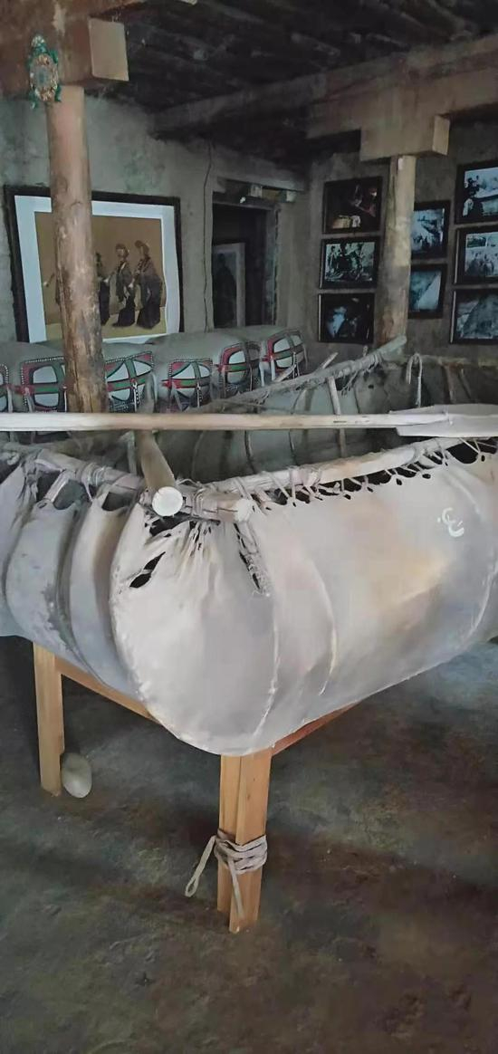 正中位置,赫然摆放了一只牛皮筏子。这个曾渡运了无数人的“老功臣”悄然挺立,百年的烟尘并未遮盖它俏丽的容颜。仔细抚摸这具做工精细,严丝合缝的老物什,眼前似乎浮现起它在鼎盛时期的辉煌与退役时刻的落寞。丁增书记说:“这艘皮船的所经历的历史便是直本仓家族一路走过的岁月,也是玉树藏区这半个世纪以来从落后走向繁荣的历程。”
