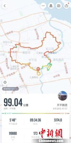 中新网上海9月30日电 (张亨伟 马凯)上海徐汇公安分局天平路派出所有一个特别的组织——天平跑团。忙碌的工作之余,每天5公里跑的群内打卡任务是他们的入会准则。为庆祝中华人民共和国成立70周年,近日,他们半天绕上海奔跑了99公里,用脚步绘制“大公鸡”地图,向祖国母亲表达祝福和敬意。