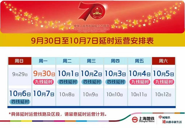 9月30日至10月6日,4、12号线将延时运营。4号线在常态末班车后,内圈方向(宜山路站→上海火车站站→世纪大道站→宜山路站)和外圈方向(宜山路站→世纪大道站→上海火车站站→宜山路站)都加开载客列车,终点站均为宜山路站。延时期间内,列车运行间隔约10-15分钟。12号线在常态末班车后,双向均加开载客列车,运行间隔约10-15分钟。加开列车“站站停”,沿途正常上下客,与其他线路在换乘站实施自然换乘。