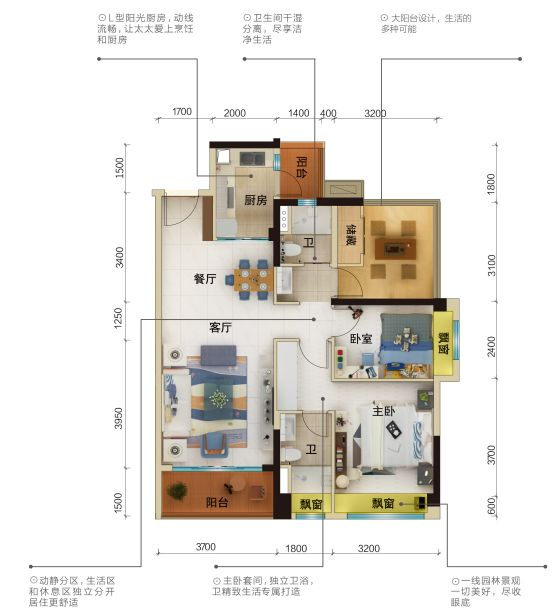 相比起80㎡的紧凑,98㎡户型显得更从容而舒适,双阳台设计,下午沏上一壶茶,捧上一本书,在观景阳台感受假日半岛的湖山时光,厨房侧面的小阳台则承担起放置洗衣机,晾晒衣服的功能。豪华主卧套间带有独立卫浴与飘窗。