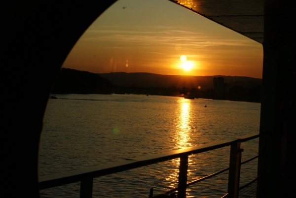 古登堡一日游结束,回到船上,一轮夕阳正如画,把莱茵河照得通亮。