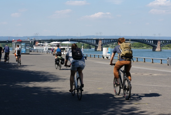在斯特拉斯堡广场上看到的纪念古滕堡雕像,预告着旅程的方向——莱茵河左岸名城美因茨。以西德首任总统特奥多尔-豪斯命名的大桥接连着莱茵河两边两个州的首府:美因茨和威斯巴登,美因茨一侧的步道除了观景,也是骑行爱好者锻炼的好去处。