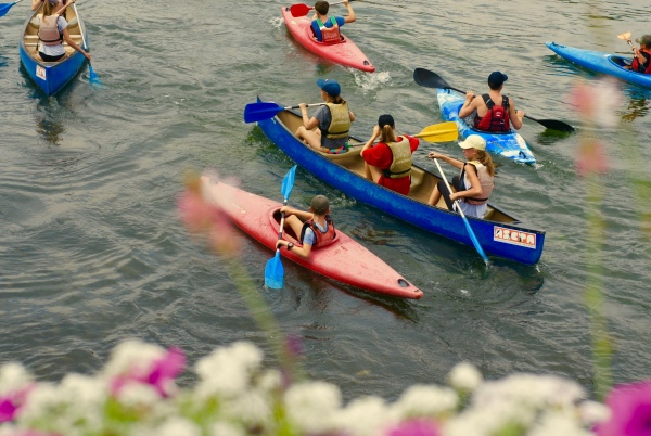 孩子们在平静的湖面上划船课