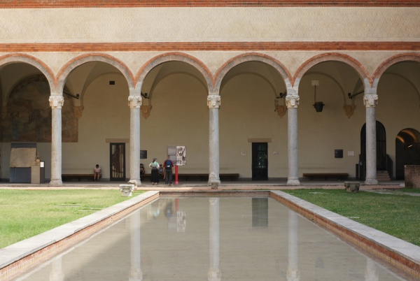 穿过长廊前往斯福尔扎城堡。四方形的城堡被高大围墙包围,对称的两边分别修建了圆形瞭望台,诉说着它最初的拥有者——维斯孔蒂家族的尚武传统。