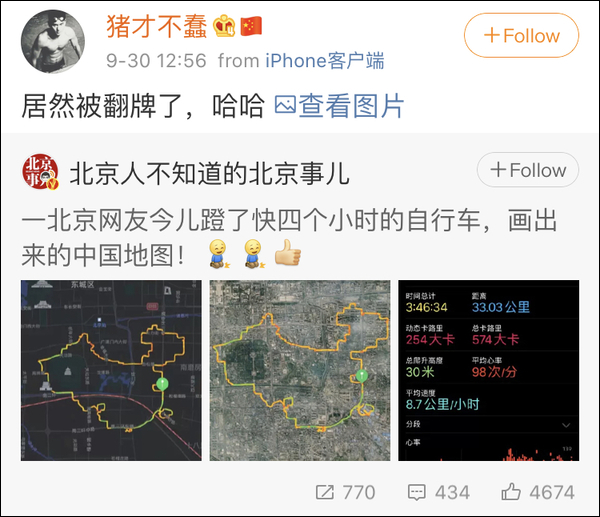 9月30日,@北京人不知道的北京事儿 发出网友投稿:“一北京网友今儿蹬了快四个小时的自行车,画出来的中国地图!”引发网友热议。随后,网友@猪才不蠢 转发认领。