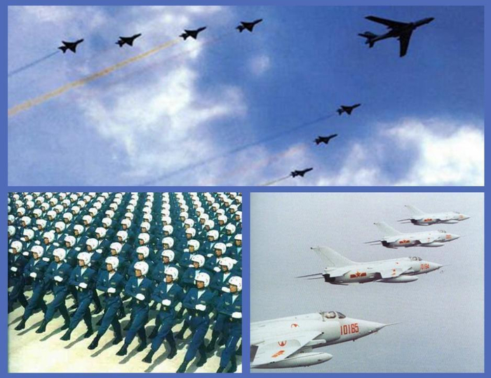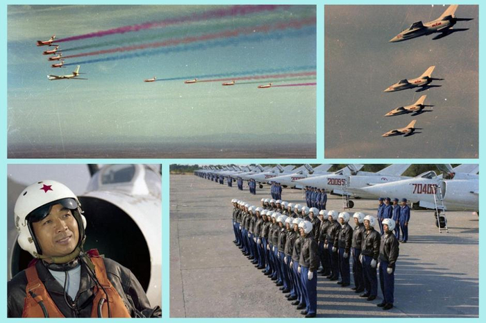 ↑1984年国庆阅兵:空中梯队共有4个,最大的机群为9机编队,比10周年空中编队增加4架飞机。在空军防空导弹部队通过天安门广场时,空中第一梯队领队、师长徐水香驾驶着轰6型飞机领航,向天安门上空飞来,8架歼教5型飞机分列两旁(左上图);强五空中编队(右下图);受阅飞行员特写(左下图);受阅飞行员地面待命(右下图)。