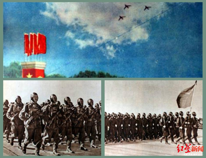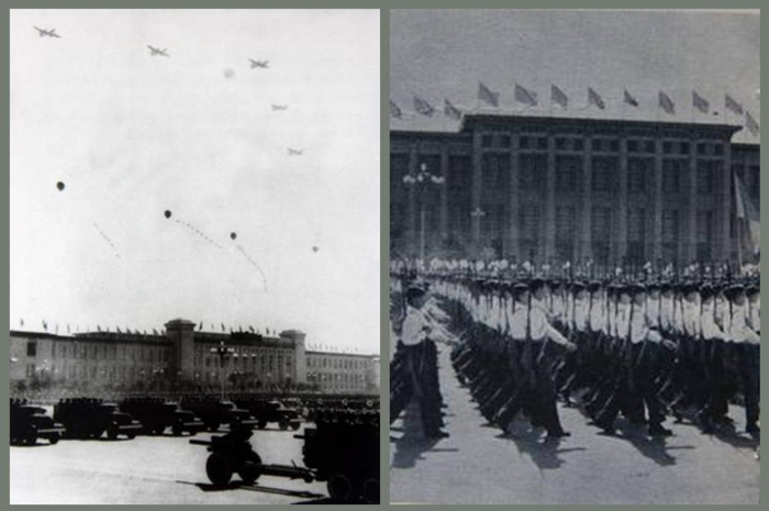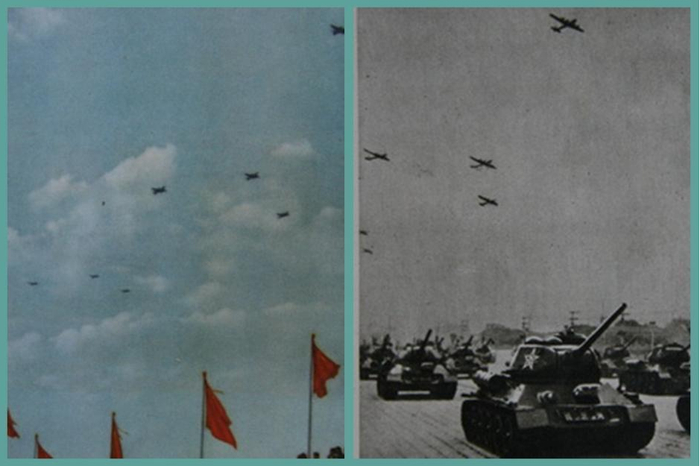 ↑1955年国庆阅兵:中国人民解放军军事学院、步兵学校、炮兵学校、工程兵学校、坦克学校、航空学校、海军学校的队伍通过天安门广场(左图 红枫摄);空军机群在天安门上空飞过(右图 邹建东摄)。