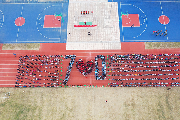 雄浑激昂的国歌声中,五星红旗迎着晨风冉冉升起。国旗下,孩子与家长们组成了“70”、“中国心”等方阵。