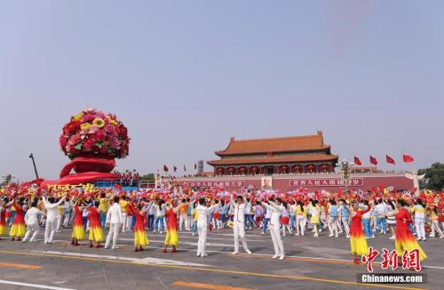 10月1日上午,庆祝中华人民共和国成立70周年大会在北京天安门广场隆重举行。图为“祖国万岁”花车经过天安门。中新社记者 杜洋 摄