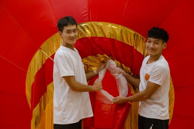 第二步学折叠。充气灯笼分内囊和外囊,运输过程中要折叠好存放。直径5米的大灯笼平放在地上,小伙子们蹲成一排,像叠衣服一样一点儿一点儿把它叠起来。充气前,再把它展开,把内囊送入外囊里面。“一个人抓着内囊的一头,从外囊的口爬进去,一直爬到顶部,只能匍匐前进。第一次觉得特别好玩,多了就非常枯燥,而且外囊里面空气很差,也特别憋闷。”充气组队员、体能训练学院大二学生孙钦畅说。