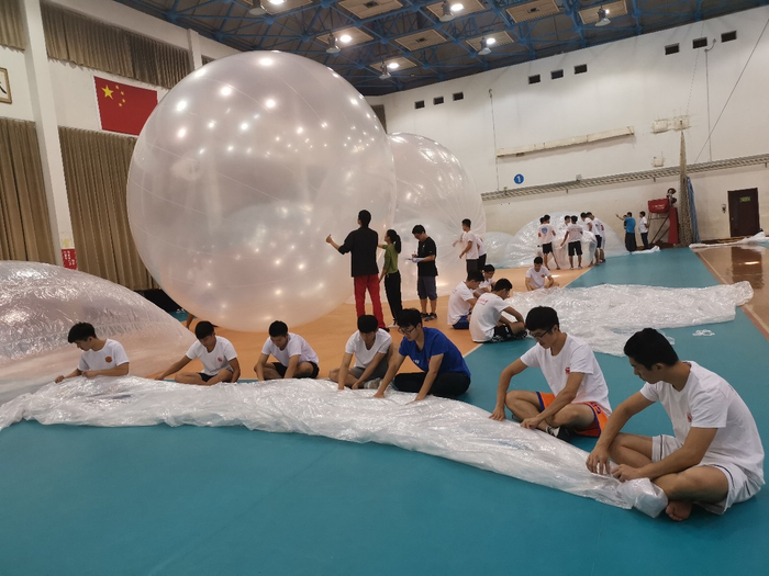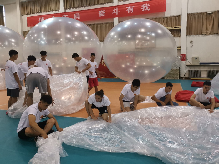 6月底,训练开始,同学们被分为充气组和施放组。充气组要提前两周训练,60个人被分成12个小组。“这真是让壮小伙干绣花的活儿啊!”充气组队员、休闲体育专业大四学生张景全说。