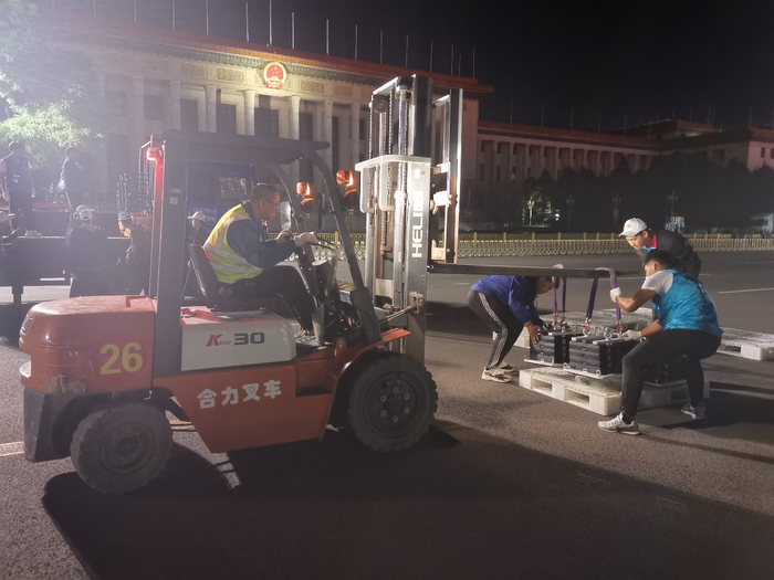 “9月30日下午,我们就在学校开始接受安检,晚上9点左右赶到天安门广场。在广场上,先要把所有设备卸下来,然后开始充气。”北京体育大学学生工作部部长周启迪介绍。两辆充气车能同时给12个灯笼充气,每个灯笼充约20分钟,所有灯笼近3个小时才能充完。