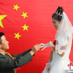 上午10点,婚礼进入最后的环节,29对新人与现场官兵一同观看阅兵盛况,并大声表白“我爱你,中国!”(完)