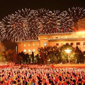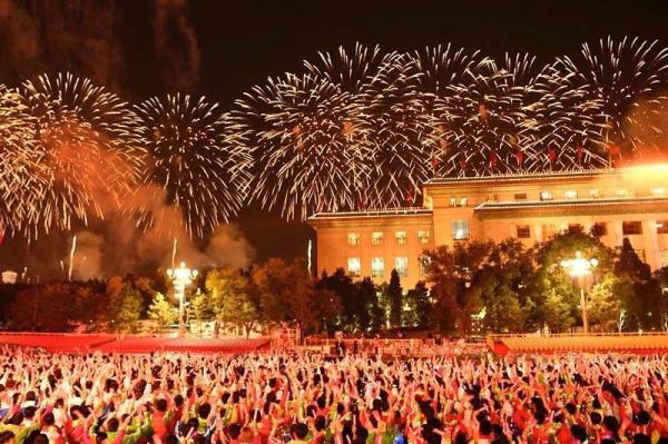 国庆联欢活动总导演张艺谋说:“为致敬人民,我们首次特别制作高难度特效焰火——‘人民万岁’,三次连续绽放,配以手持烟花、音乐烟花和各种新型礼花,使天地交相辉映,铺展出一幅欢乐祥和的盛世图景。”