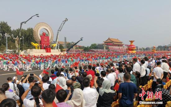 10月1日上午,庆祝中华人民共和国成立70周年大会在北京天安门广场隆重举行。图为群众游行。中新社记者 毛建军 摄