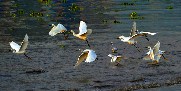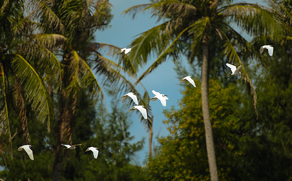 海南东寨港国家级自然保护区位于东亚-澳大利西亚候鸟迁飞线路上,每年到了8月底9月初,就会有越冬水鸟陆续飞来,在此越冬或者迁飞路过。到9月下旬开始,大批小白鹭现身东寨港。12月到第二年1月,东寨港的越冬水鸟最多。根据统计数据,最多的时候一次记录到3万多只。