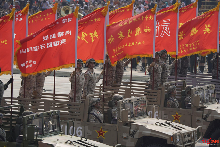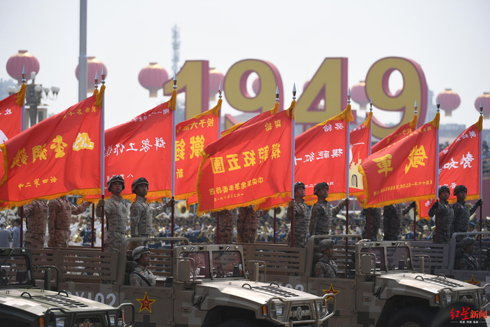 1日举行的阅兵分列式上,带领580台(套)装备接受检阅的,是首次亮相国庆阅兵场的战旗方队。东、南、西、北、中五大战区指挥员挺立排头,25辆猛士敞篷车载着解放军历史上涌现出的100面荣誉战旗迎风招展。全军荣誉功勋部队代表组成的战旗方队浩荡而来。