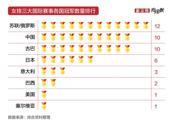 从近40年各国女排获得世界三大赛事的冠军总数看,苏联/俄罗斯夺冠次数最多,12次。其次是中国和古巴分别是10次。