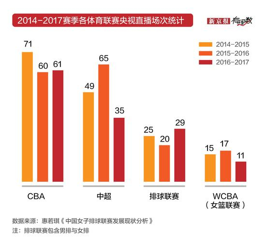 中国女排前队长惠若琪在《中国女子排球联赛发展现状分析》中提到,在2014-2017赛季各项体育联赛央视直播场次中,CBA的场次几乎是排球联赛的2.5倍多。