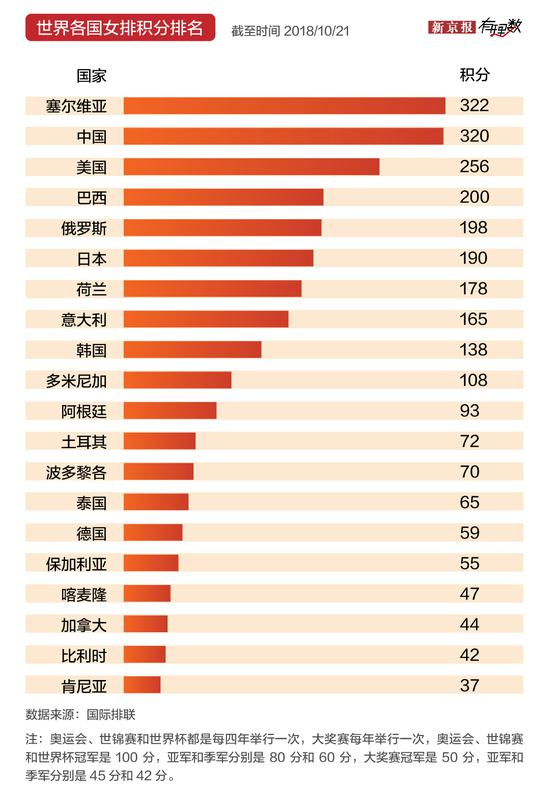 在2018年世锦赛中,中国女排以两分之差惜败意大利队,失去了与塞尔维亚争夺冠军的机会,获得当年的季军。这是塞尔维亚能排在第一名的原因。
