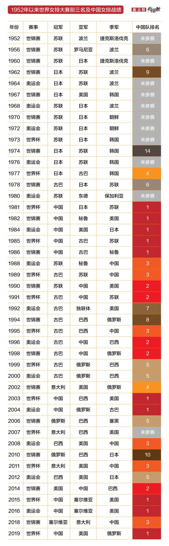 战场上没有永远打胜仗的将军,排球场也是。从1952年第一届世界女排锦标赛到2019年女排世界杯,半个多世纪里,中国女排在三大赛的成绩上整体呈稳定态势,但也有起起伏伏。