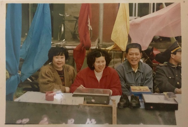 这张照片摄于上世纪九十年代的彭浦新村集市口,当时正是集市的鼎盛期。照片里对着镜头笑得正欢的男子就是我。当时我担任彭浦新村集市个体协会的会长。旁边两个女同事是协会的理事,当时个体协会和工商局是协作关系,协管彭浦新村集市。