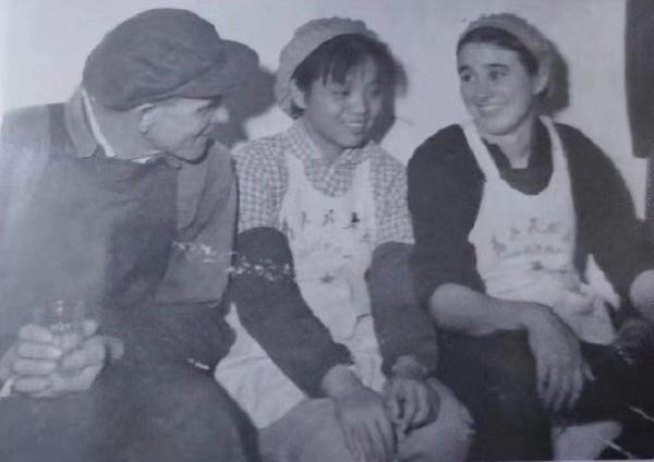 这张老照片拍摄于国棉十七厂,正中间就是我,包霞芳,右边是我的外国女徒弟阿利司。我正在教她纺织技术。别看我照片上显得腼腆,但我的纺织技术可是“一只鼎”。