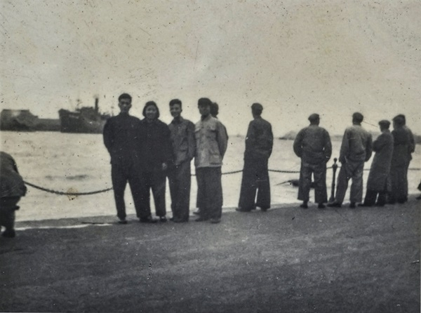 这张照片摄于上世纪50年代。冬季的周末,同事喊我:“张启明,要不要一起去南京东路外滩游玩啊?”爱好摄影的我,为了这次游玩,还特地向朋友借了相机。站在照片中人群的最左侧,我按下了摇控自拍按钮。在当时的技术条件下,我们留下了小小一张成片。现在看来,这个背景有些简陋,但大轮船、小舢板还有江面已经是当时最好的拍照背景了。黄浦江对岸,我依稀记得大船边的建筑是个厂房,厂房周边显得相对低矮。这片背景所在的位置,也就是现在浦东新区陆家嘴的位置。