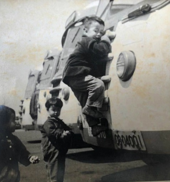 照片中,趴在车头的是我的妹妹。当时,她正沿着车前的护栏,一格一格地往上爬,我和二妹都看着她。此时,父亲说了一句:“看这里!”我和妹妹不约而同地看向父亲,但是二妹还是被她姐姐的“英姿”吸引,目不转睛地看着她。我在照片里和车轮子差不多高。