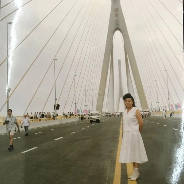 这张照片拍摄于1993年,照片上的人是我妈妈,叫黄金梅,那天她和几个好姐妹一同到杨浦大桥上参观,在桥面上拍摄的唯一一张照片,非常珍贵。