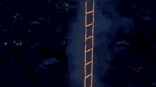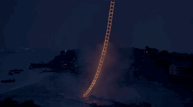 对蔡国强本人来说,意义尤为重大的还有一架“梯子”。2016年,蔡国强首部个人纪录片《天梯:蔡国强的艺术》在国内上映。这是他献给家乡和百岁奶奶的礼物片,除了珍贵的创作影像,也从方方面面体现了他对家乡、对祖国的眷恋和热爱。《天梯》项目辗转各国各地,最后在他的家乡取得成功,小小的渔村上空升起燃烧着金色焰火的长梯,绚烂壮丽的景象与目睹着这一切的创作者,他虽不再年轻,梦想却始终如一。画面中,一座500米高的“天梯”拔地而起,仿佛凡人登天,联通了宇宙和地球。金色的火焰沿着梯子从地面窜上天空,夜空之下尤其壮观。