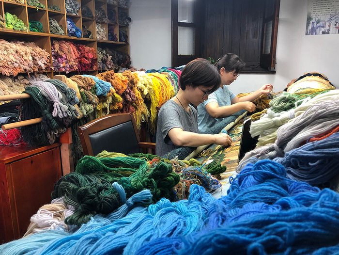 事实上,绒绣最难的,也是选色染色部分。因为要反映出不同光线下颜色的细微差异,蓝就会有很多层次,怎么搭配和表达,极其考验绣娘的功力。往往,市场上没有那么精细分层的颜色,就要自己调配和染线。所以,她们的绒线库房,有数百种不同的颜色。