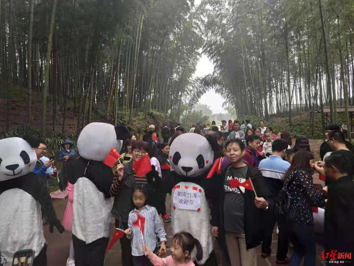 据了解,在国庆长假期间,蜀南竹海景区工作人员集体身着熊猫衣服,变身激萌玩偶人,在景区内“翡翠长廊”、“忘忧谷”、“七彩飞瀑”等景点与游客唱歌互动、拍摄小视频,同时还会为游客送上精美礼品。